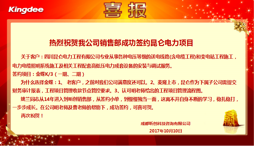 热烈祝贺我公司销售部成功签约昆仑电力项目