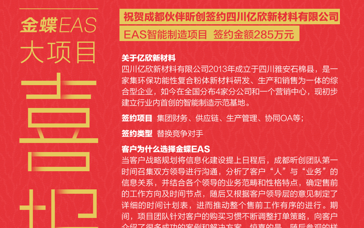 我公司成功签约四川亿欣新材料有限公司EAS智能制造项目