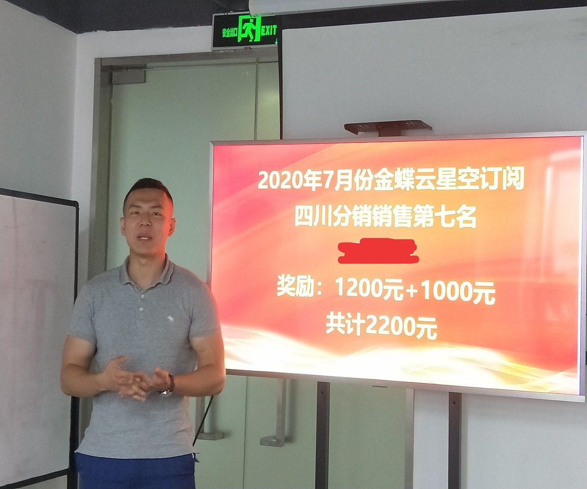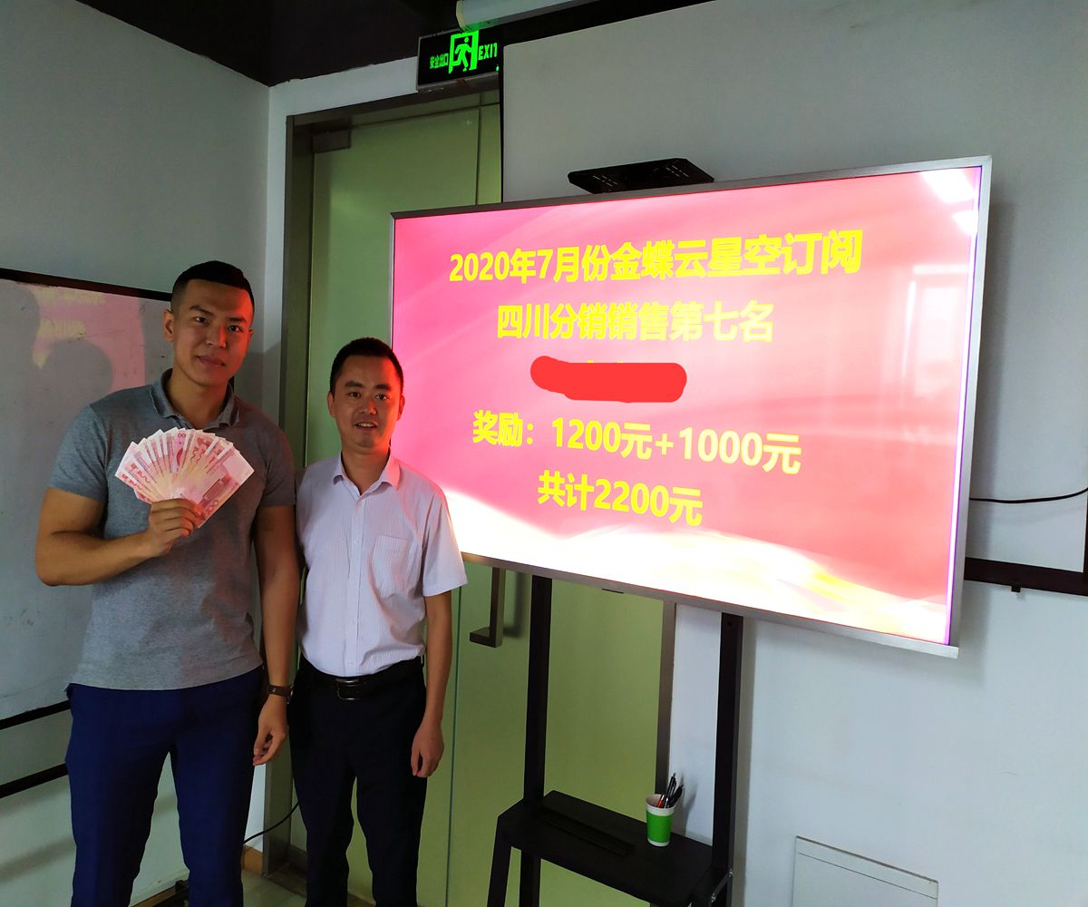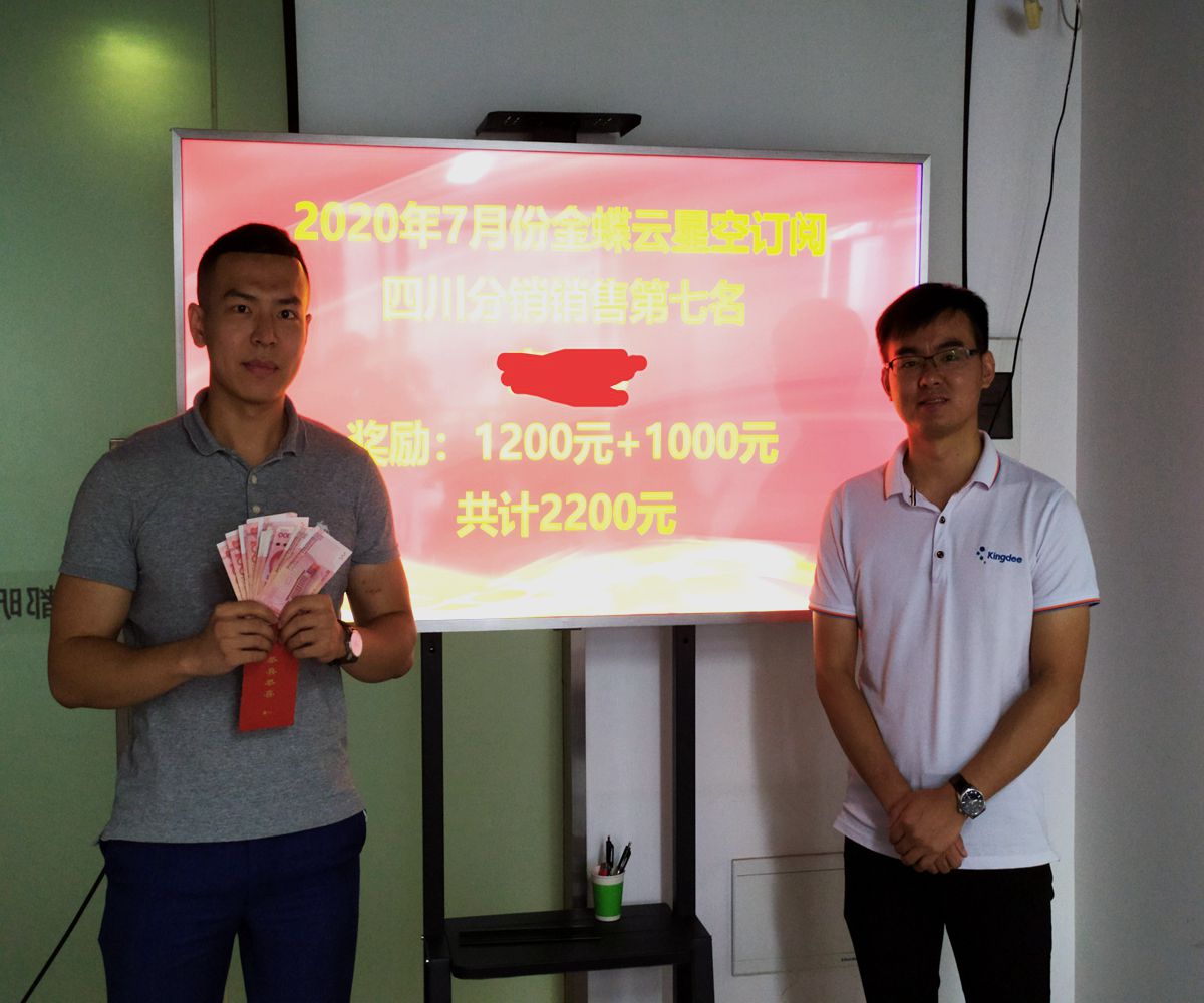 自雍经理入职以来,经过几个月的奋斗与坚持不懈,积极努力学习,一直不停签约,终荣获2020年7月金蝶云星空订阅.四川分销销售第七名。因此分别获得金蝶分公司与公司的现金奖励。